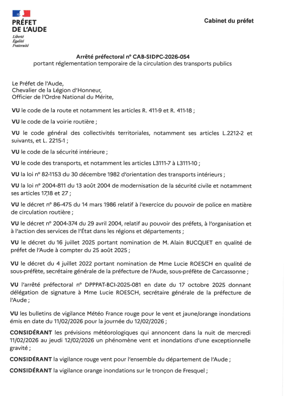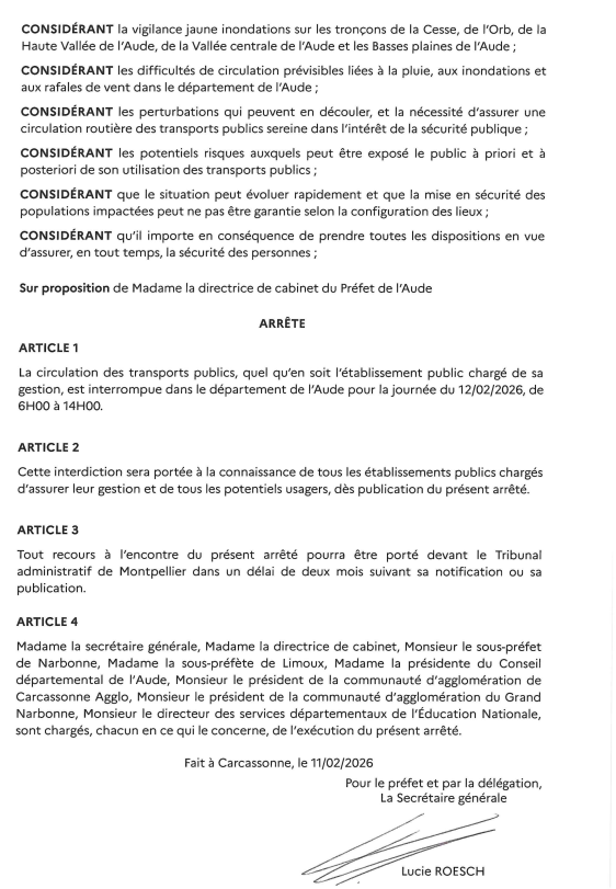 Arrêté préfectoral portant réglementation temporaire de la circulation des transports publics